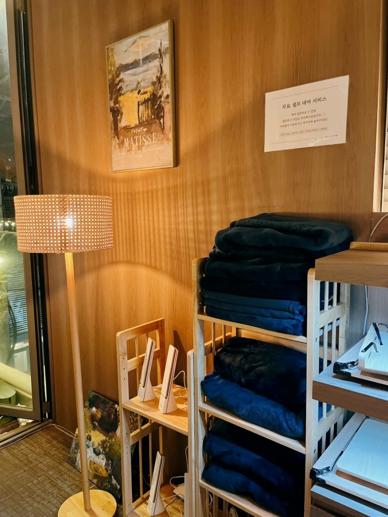욕망의 북카페는 담요와 스탠드, 그리고 책 살균기가 마련되어있다.