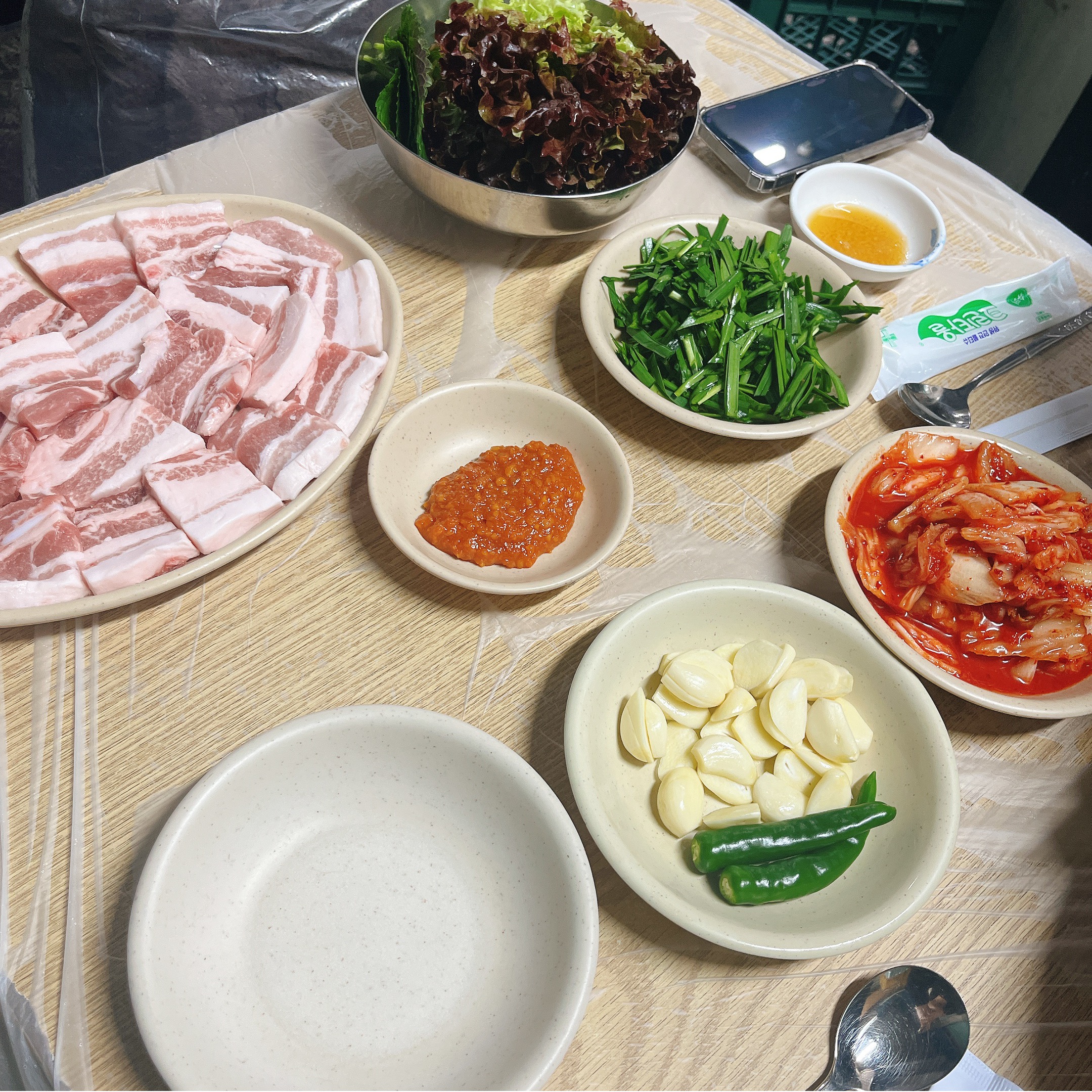 고기와 같이 구워 먹을 김치, 부추, 마늘, 고추, 쌈장, 듬뿍 담은 쌈과 함께 고기.. 맞이