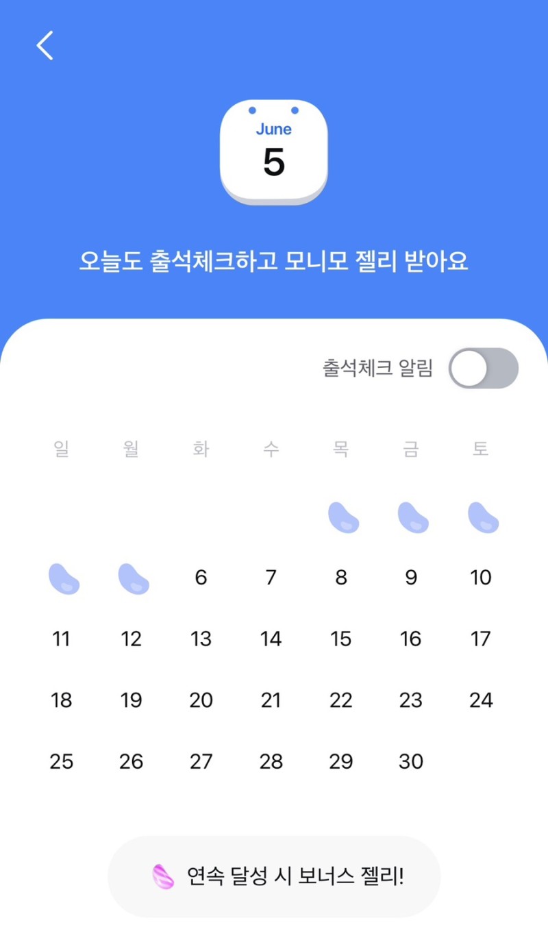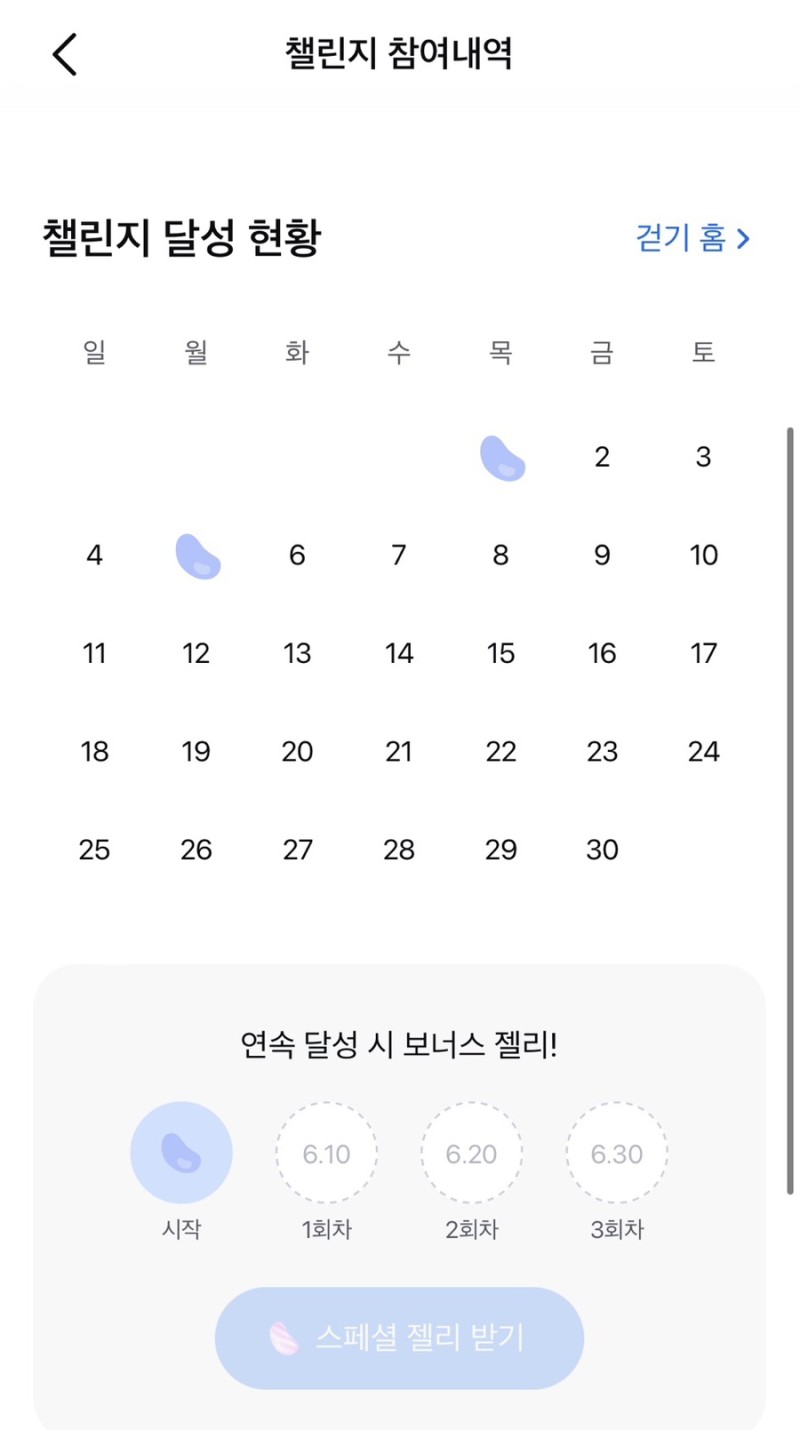 출석체크는 한달 연속, 걷기는 10일 연속 등 챌린지마다 다르니 보너스 젤리를 받을 수 있는 방법이 많이 있다.